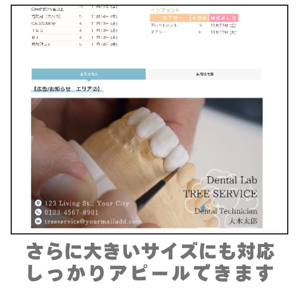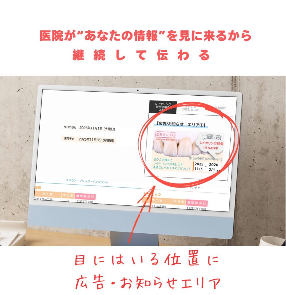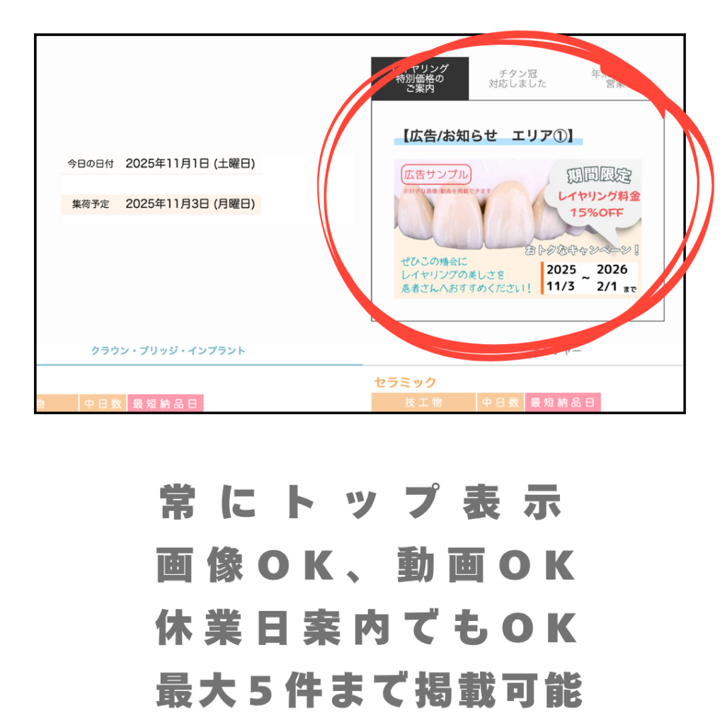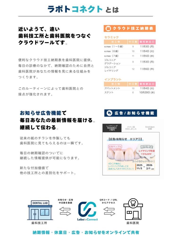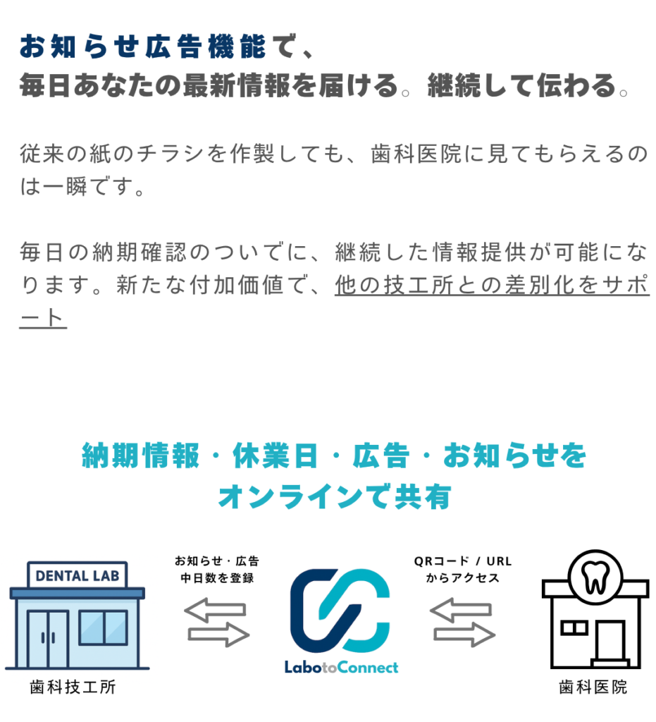Labotoconnectなら、 歯科技工納期表 と 広告やお知らせを、医院にわかりやすく共有できます。