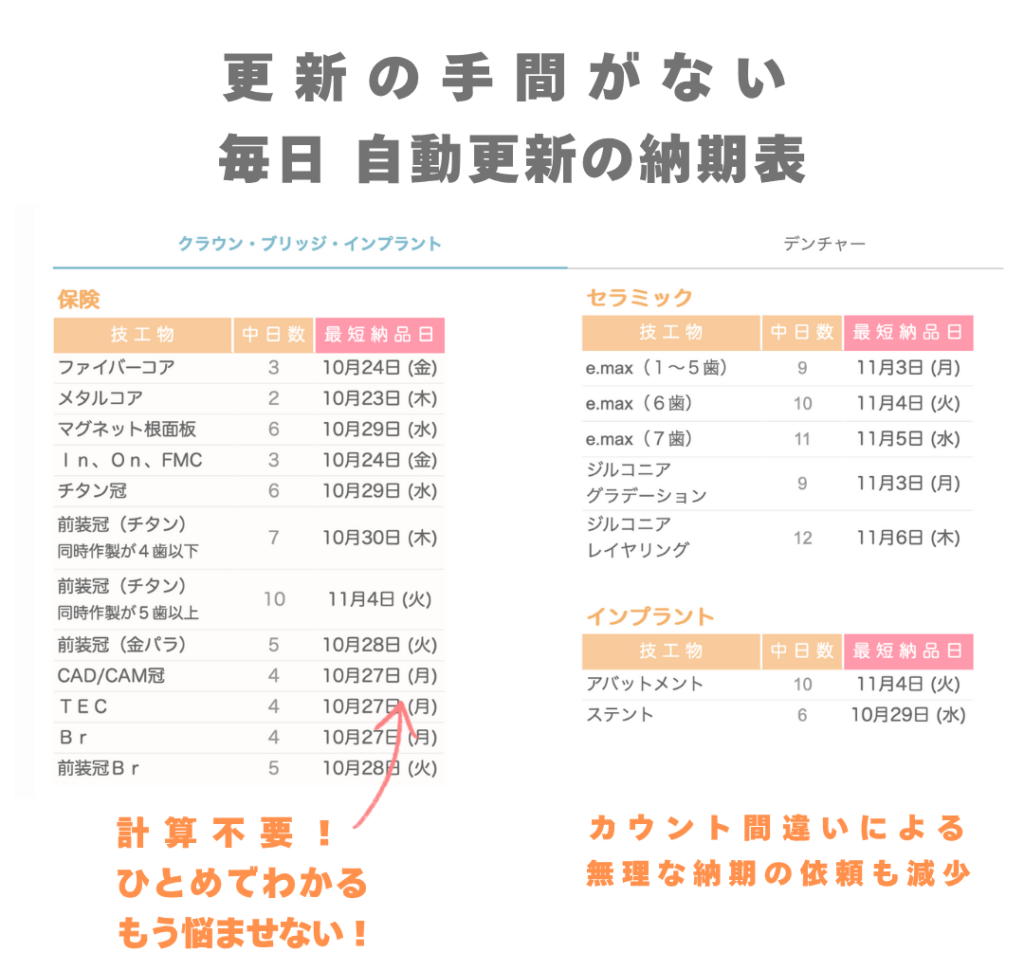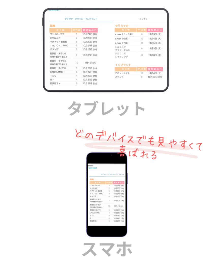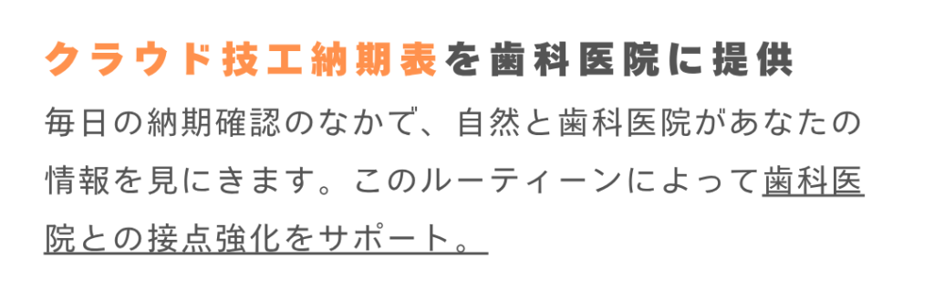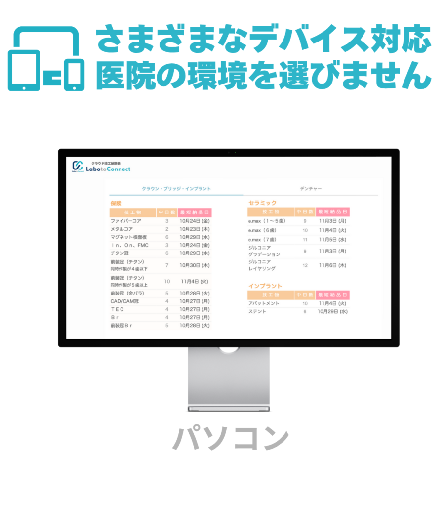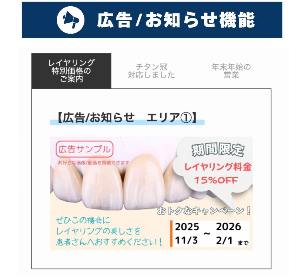 Labotoconnectなら、 歯科技工納期表 と 広告やお知らせを、医院にわかりやすく共有できます。